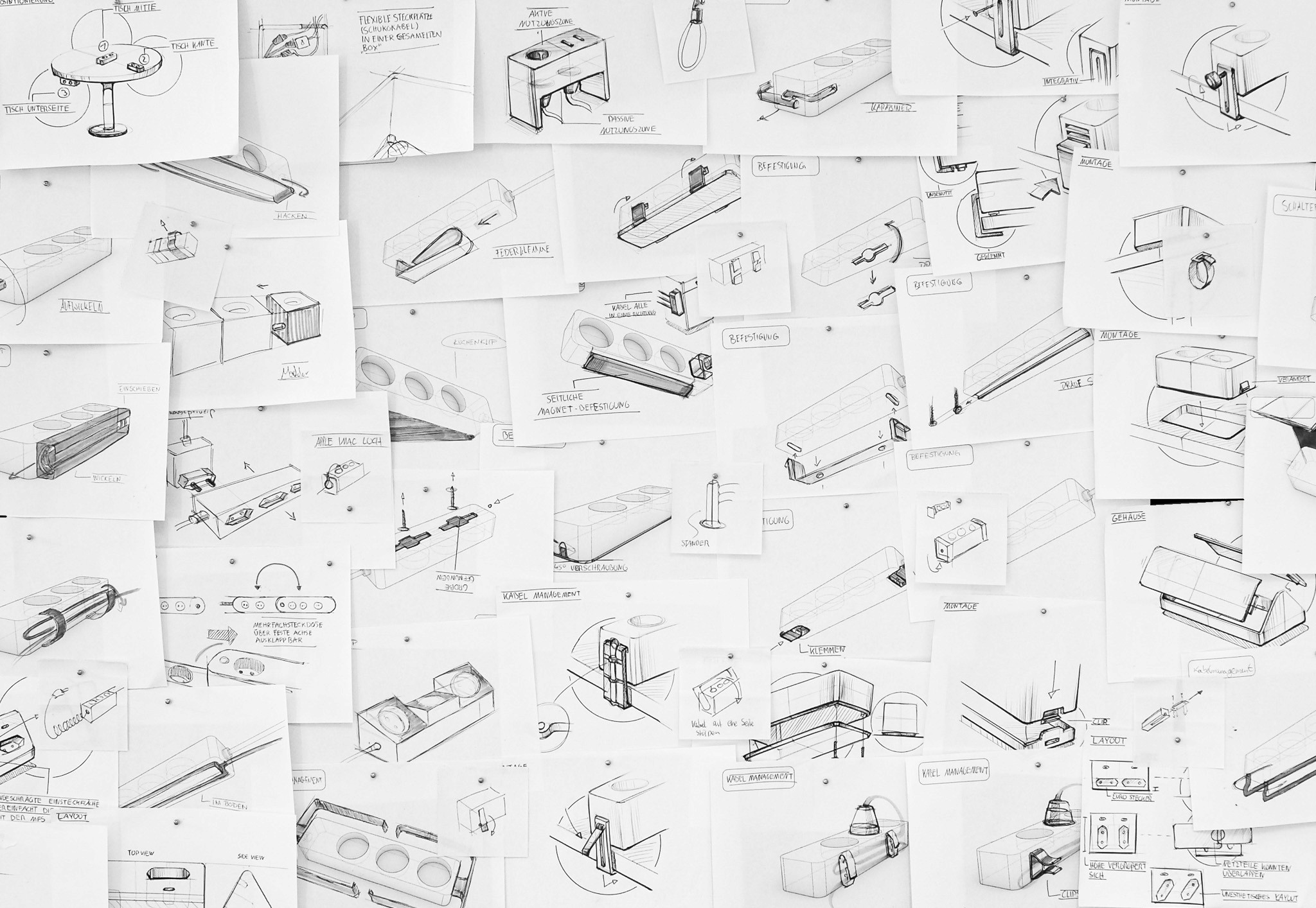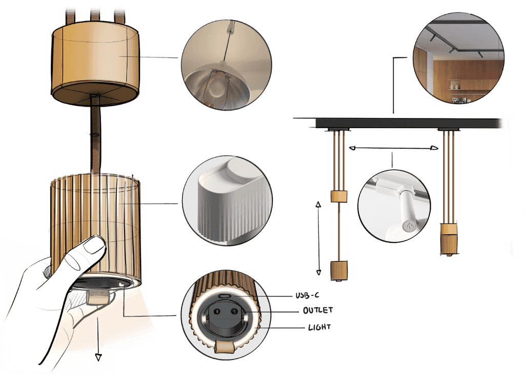The initial solution fixated on a rigid table socket – easy to use but always visible and disruptive. Inspiration from a counter-pendulum light led to a more blended design approach.
