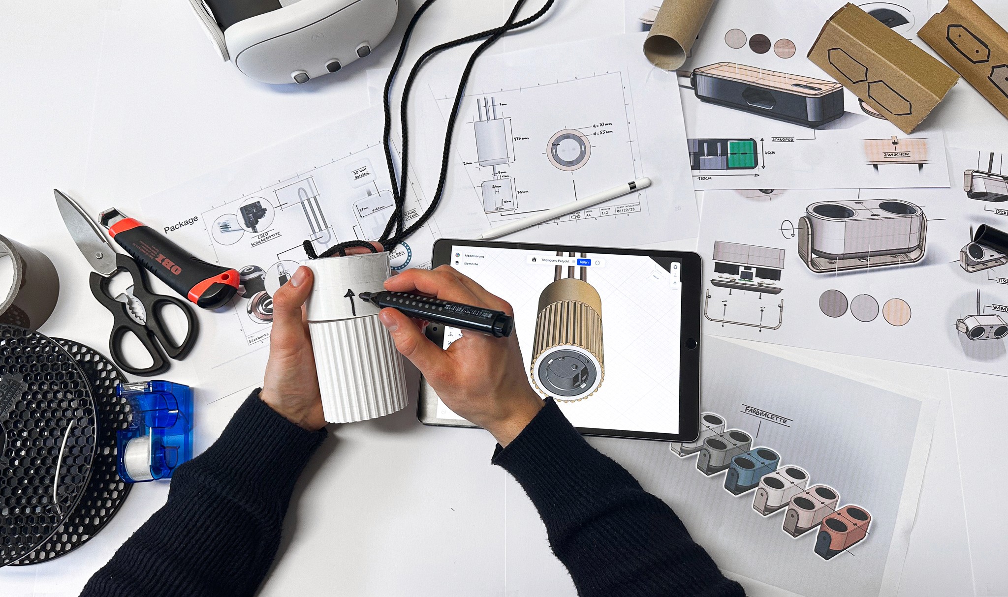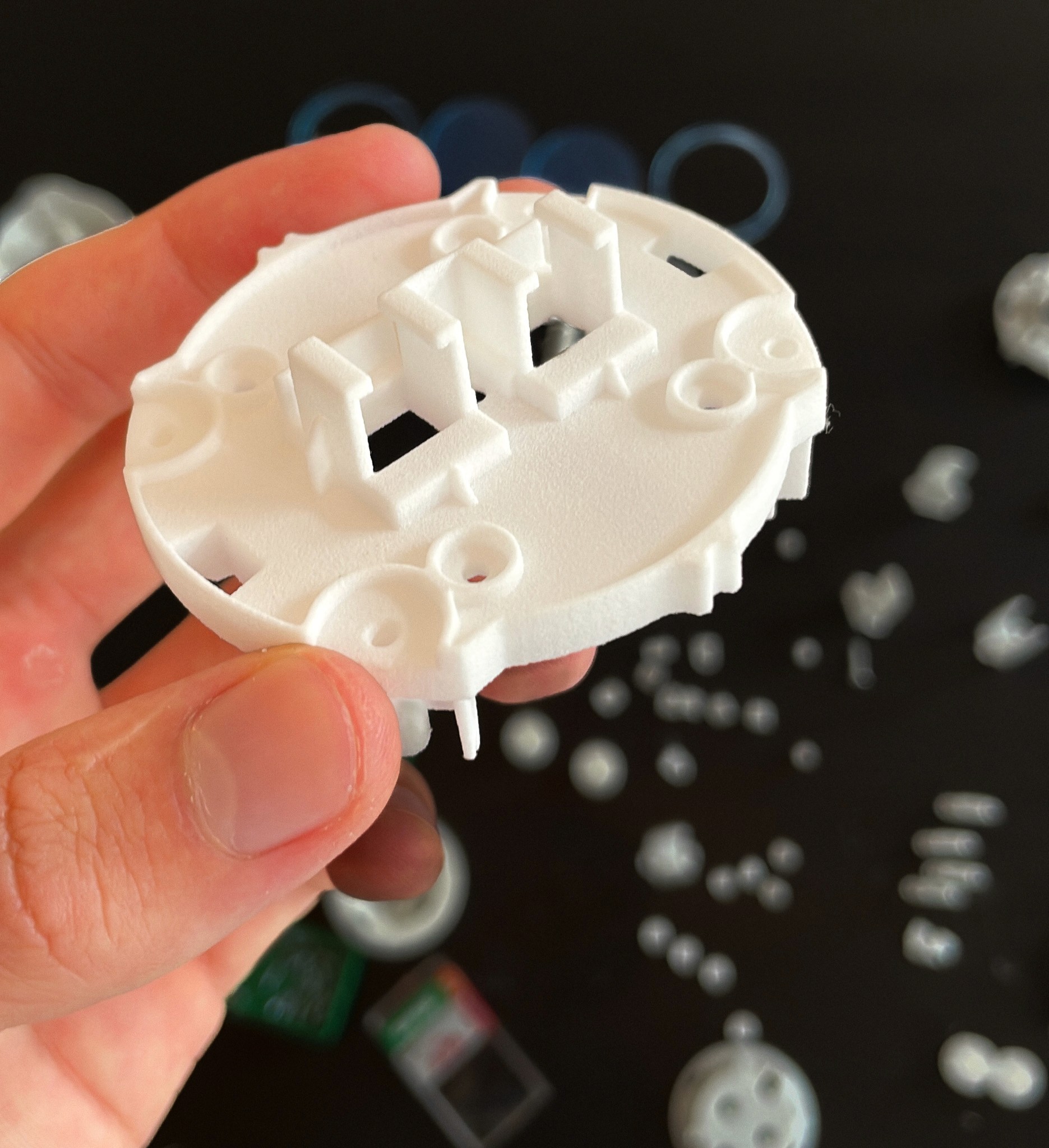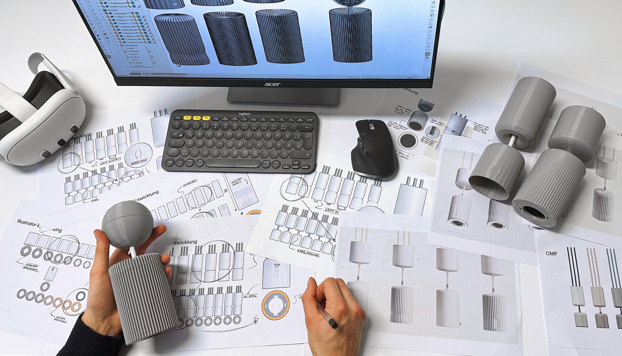 The design took shape in Illustrator and SolidWorks – a simple base form, inspired by café interiors. 3D prints tested proportions and touch.